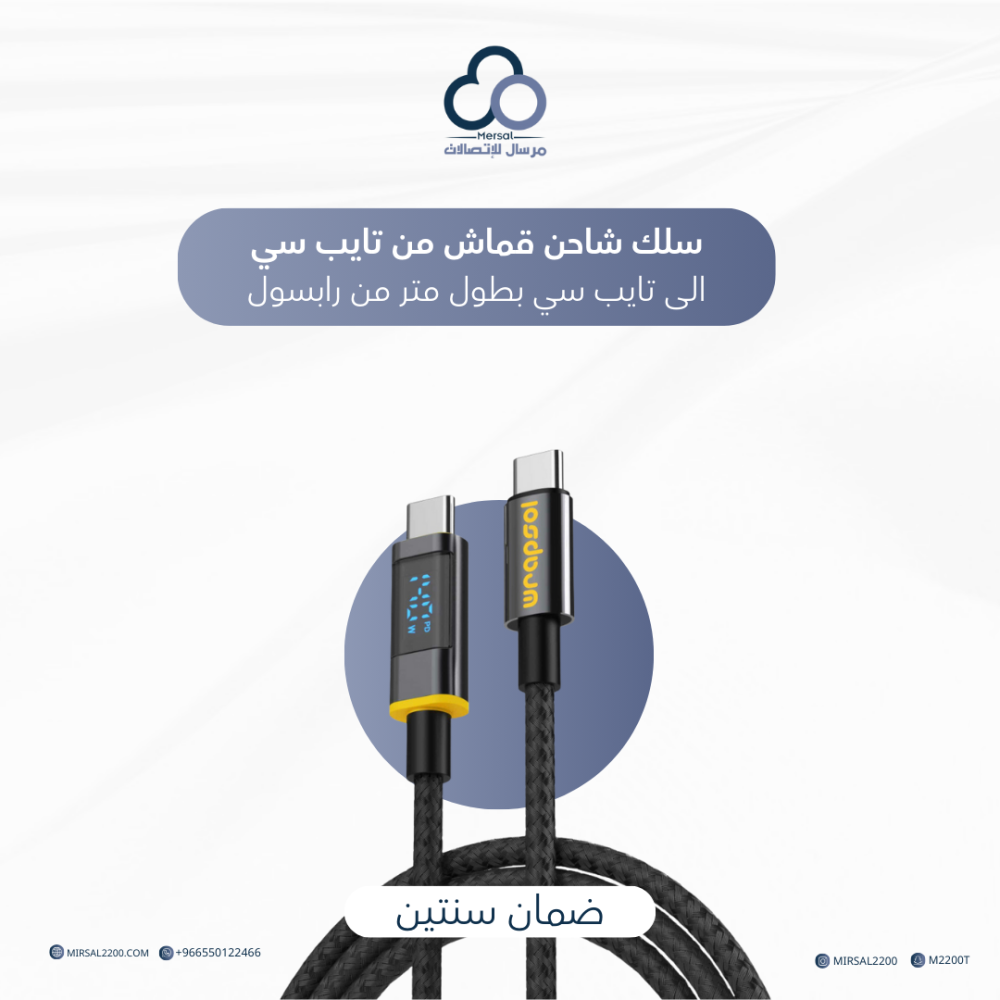 سلك شاحن قماش من تايب سي الى تايب سي بطول متر من رابسول - ضمان سنتين