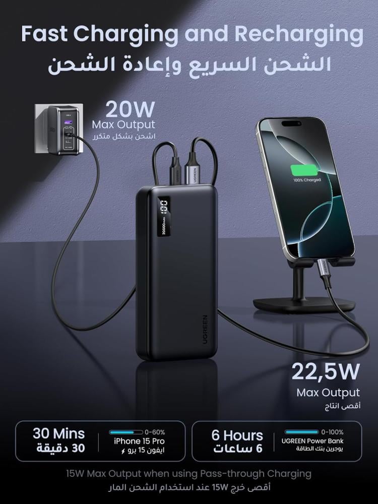 🔋 يوغرين – باور بانك 20,000mAh مع كابل USB-C | طاقة تدوم وأناقة تدوم! ⚡احتفظ بطاقة إضافية معك أينما ذهبت مع باور بانك يوغرين 20,000mAh، المصمم ليوفر شحن سريع وآمن لأجهزتك، مع كابل USB-C مرفق لراحة أكبر في كل استخدام. مثالي للسفر، العمل، أو الاستخدام اليومي.