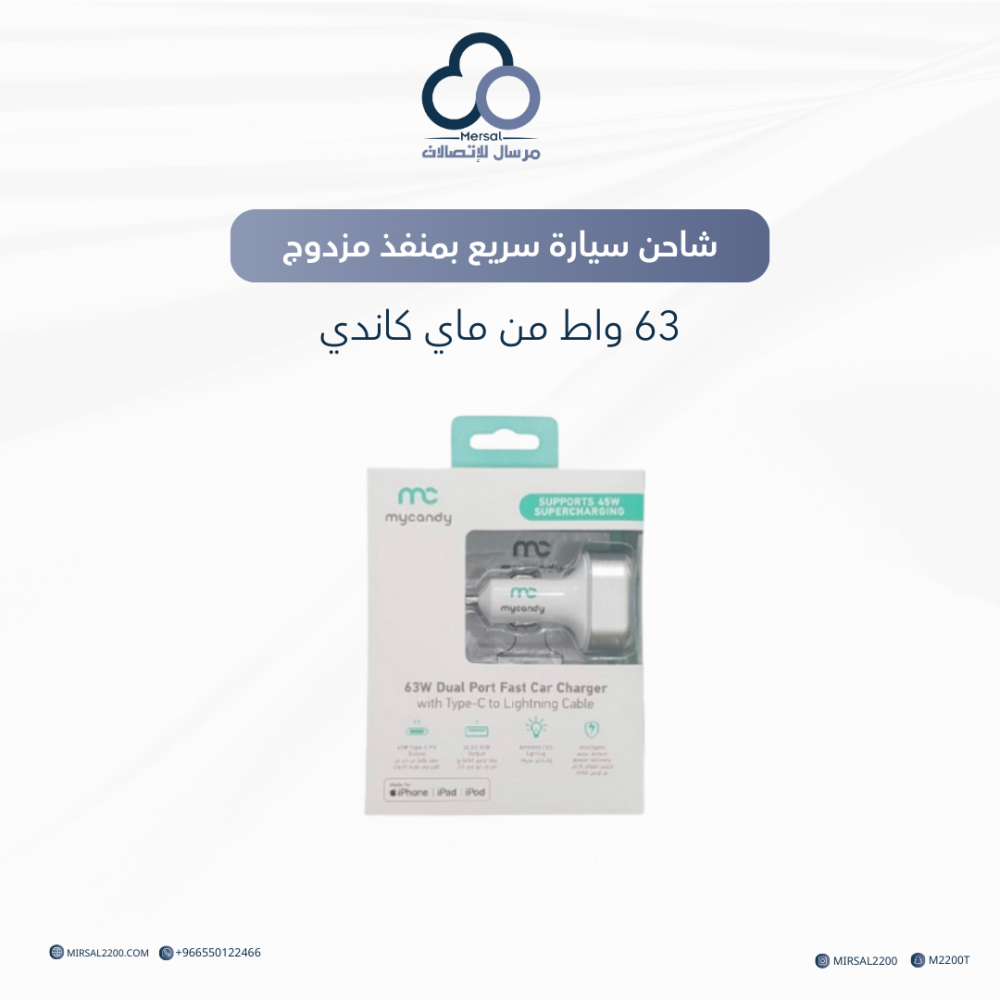 شاحن سيارة سريع مزدوج المنفذ مع كابل من النوع C إلى Lightning كابل 63W