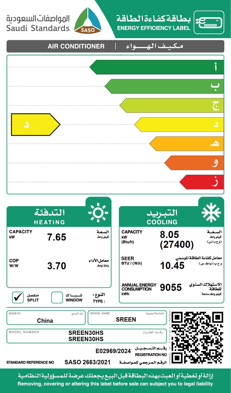 مكيف هواء SREEN سبليت - قدرة 27400 وحدة (بارد/حار)أداء استثنائي للمساحات الكبيرة جدًا مع مكيف SREEN الأقوى في المجموعة، حيث يقدم قدرة تبريد 27400 وحدة وتدفئة 27000 وحدة BTU. مصمم لتوفير أقصى درجات الراحة في كل الظروف.